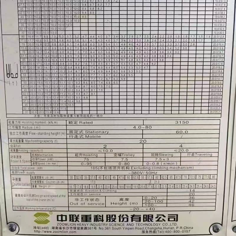 The Zoomlion WA350-20 used tower crane offers excellent performance, adaptability, safety features, maneuverability, and user-friendliness. Its impressive lifting capacity, a wide range of jib length combinations, and wind resistance make it the preferred choice for a variety of construction projects. With its advanced safety system, precise maneuverability, and simplified maintenance procedures, the crane ensures efficient and safe lifting operations. Trust the Zoomlion WA350-20 to meet your construction needs and experience a superior operating experience.